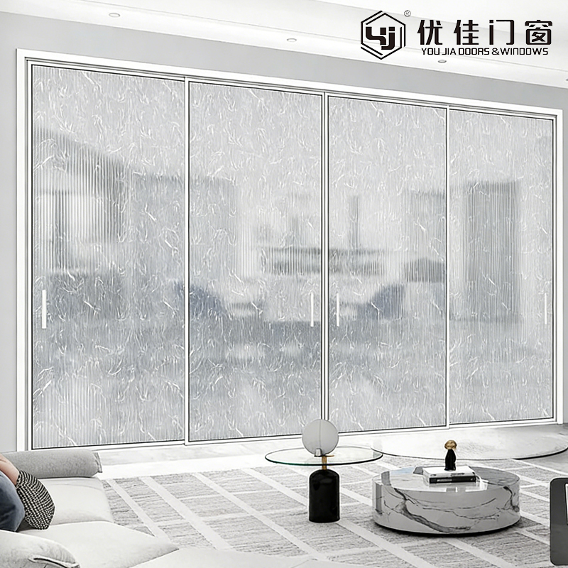 Fabricada com materiais duráveis e de alta resistência, a moldura branca e fina resiste ao desbotamento e ao desgaste, mantendo sua aparência nítida ao longo do tempo. O vidro texturizado é tratado para aumentar a resistência a arranhões e a difusão da luz, com padrões exclusivos que adicionam um elemento tátil e artístico ao design. O mecanismo deslizante suave opera silenciosamente e sem esforço, com necessidade mínima de manutenção. Seu perfil linear limpo integra-se perfeitamente com outros elementos arquitetônicos, criando uma aparência unificada ao lado de instalações de portas giratórias e janelas de batente.